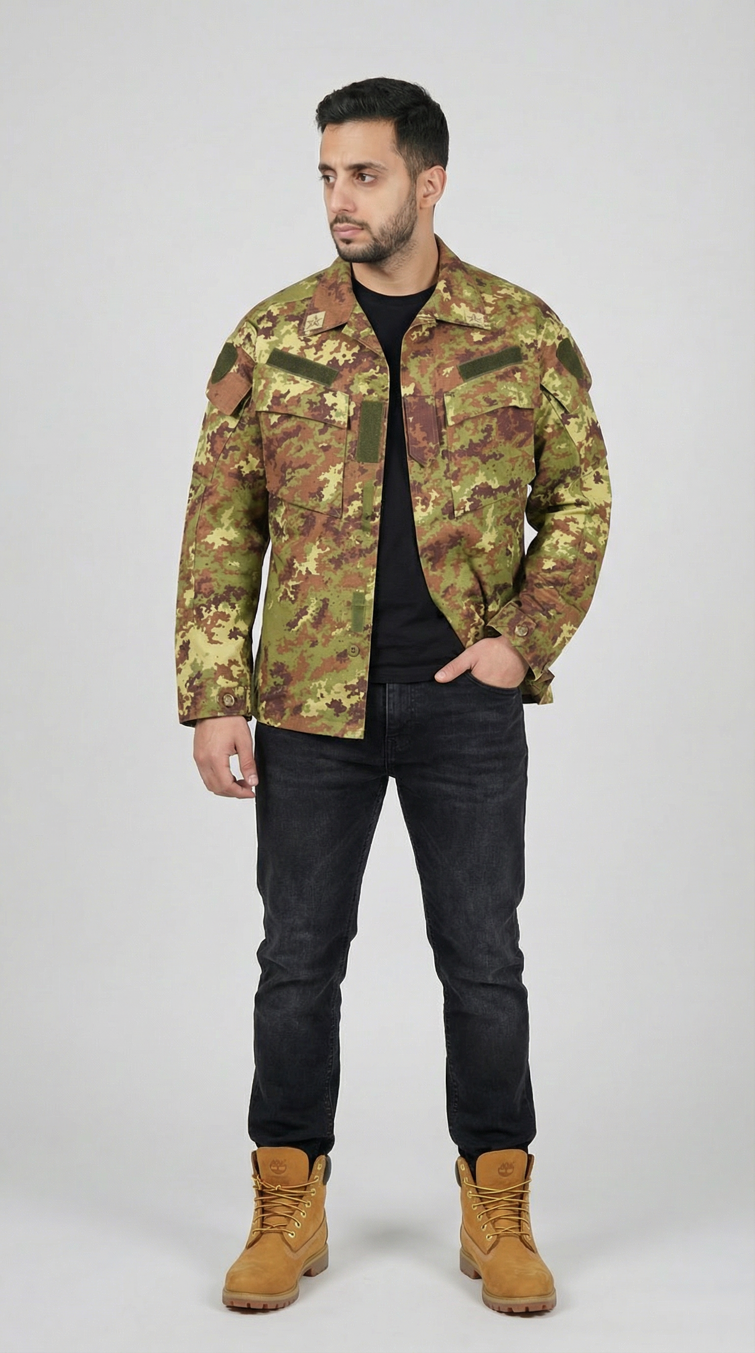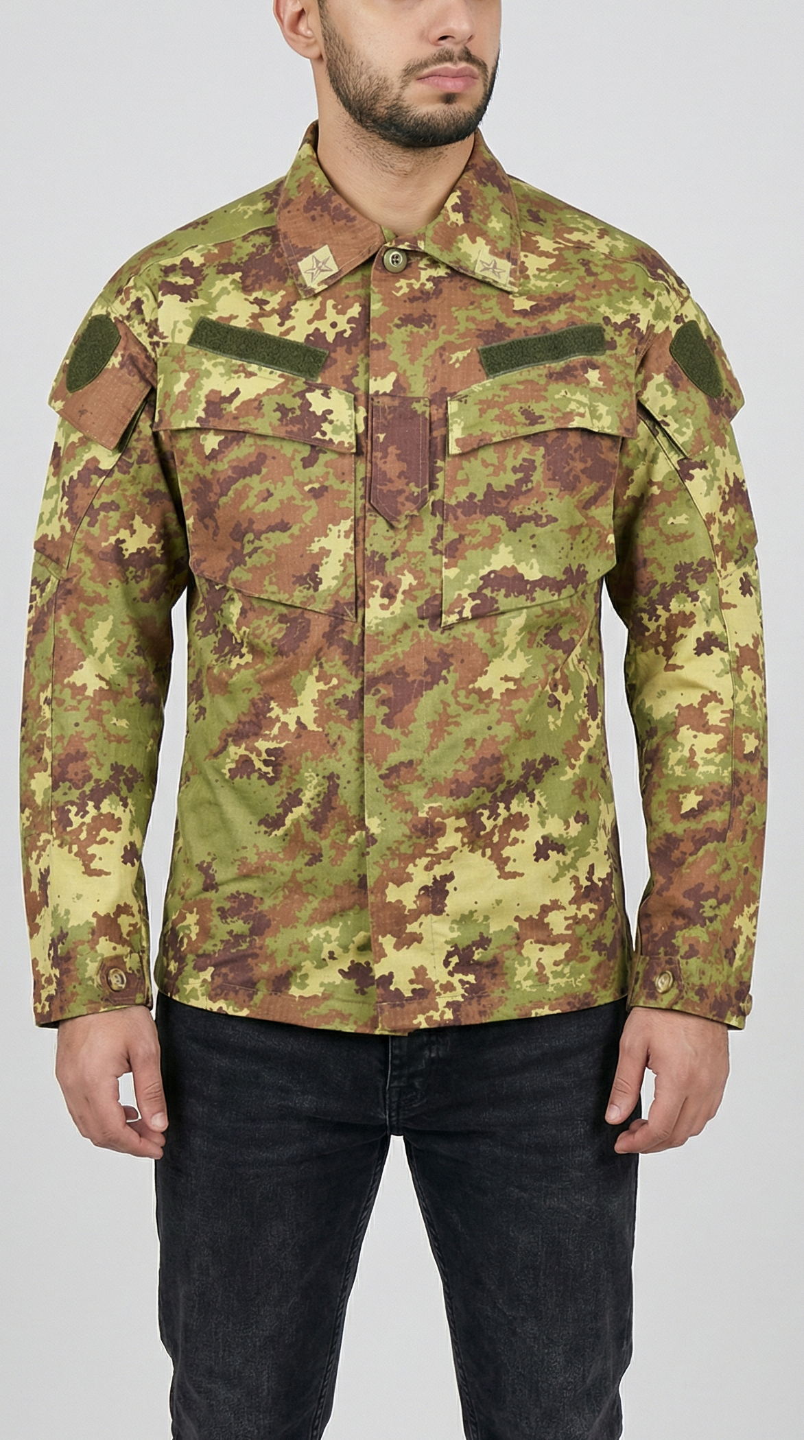 The Italian Army Esercito Vegetato camo field shirts howcase the successor to the iconic Italian Armed Forces M92 pattern based on the US woodland camo patern.. Featuring a distinctive blend of chocolate brown, russet, and olive green shapes on a khaki base, this camouflage was first adopted by the Italian Army in 2004 for general issue. Its unique mottled design not only offers authentic military style but also ensures excellent blending in vegetated environments. Durable and versatile, these cargos are perfect for those seeking functional military-inspired apparel with a rich heritage. Embrace the legacy of Italian Armed Forces with these standout camo cargos.
