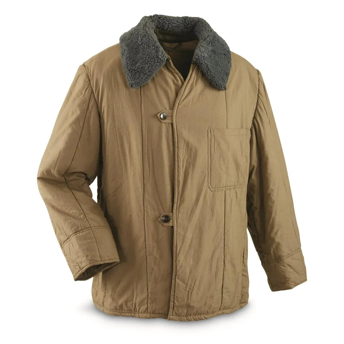 Experience authentic Cold War heritage with the Hungarian Army M65 Parka—a heavyweight cotton canvas essential that blends rugged functionality with unmistakable vintage appeal. This military-grade piece features a secure button-up front, dual slash pockets for practicality, and a wind-blocking throat tab designed for real protection. The removable insulated cotton liner in tan, olive drab, and other period-correct shades ensures warmth without compromise, while the luxurious synthetic fur collar adds both comfort and commanding presence. Crossed rifles epaulets mark this as genuine military surplus. Ideal for those who value authentic craftsmanship, historical significance, and a style that speaks volumes.