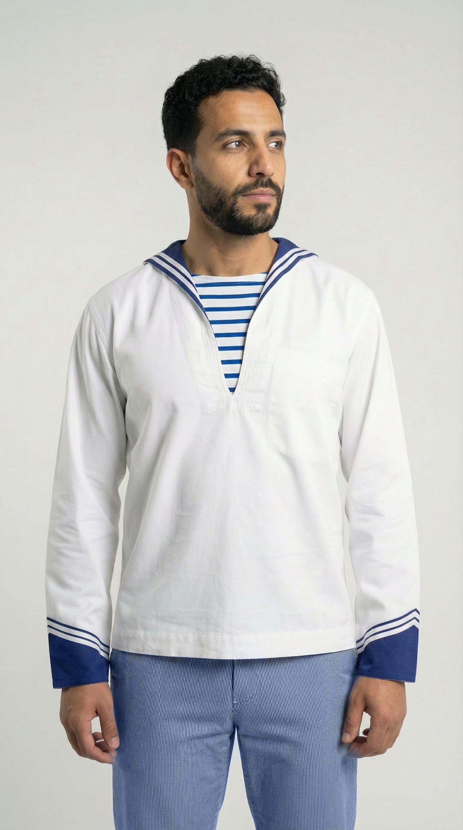 Early 2000s Italian Navy Marina military middy shirt in crisp white with striking rich blue cuffs. Crafted with meticulous attention to detail for Italy's naval service, this lightweight warm-weather piece features a regular fit in a synthetic-cotton blend or pure cotton construction. Perfect for coastal escapes—the Hamptons, Cape Cod, yacht clubs, and seaside gatherings. Layer it effortlessly with linen or pair with seersucker shorts and trousers for an authentic nautical aesthetic that bridges heritage military style with relaxed summer elegance. Can be worn with a nautical shirt under or without !